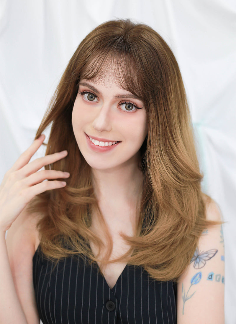 18" Long Straight With Bangs Two Tone Brown Lace Front Remy Natural Hair Wig HHW016